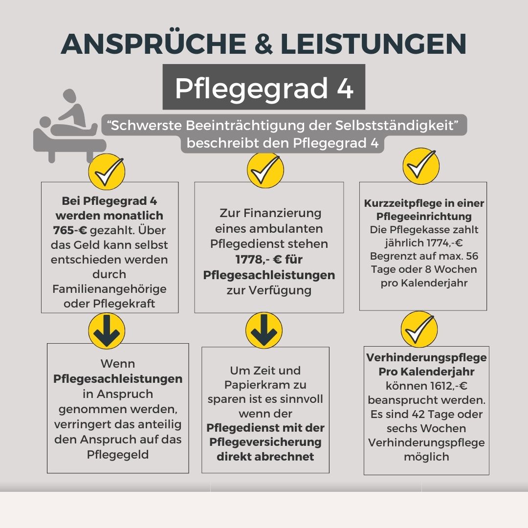 Bei Pflegegrad 4 erhalten sie 765,00 € Pflegegeld monatlich von der Pflegekasse. Über den Beitrag kann frei verfügt werden. Das Geld kann an pflegende Angehörige weitergegeben und verwendet werden.
